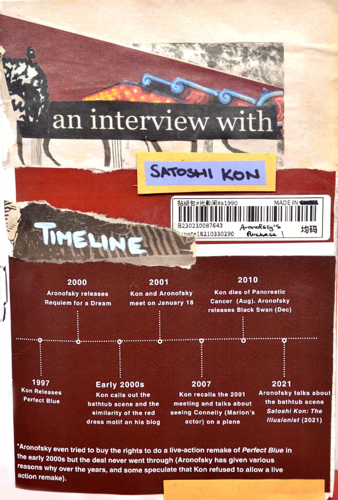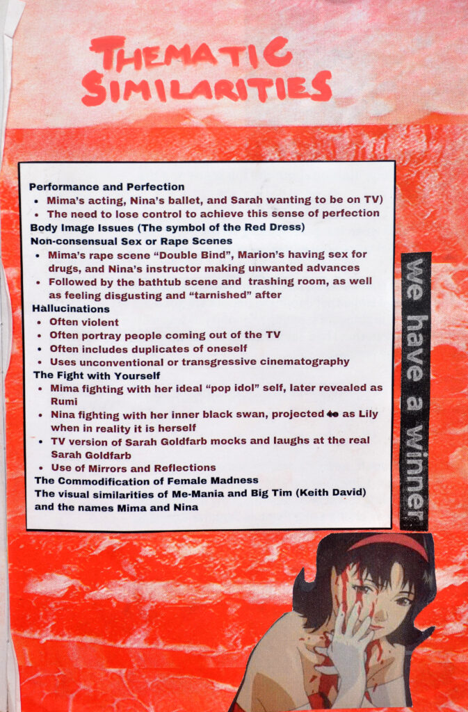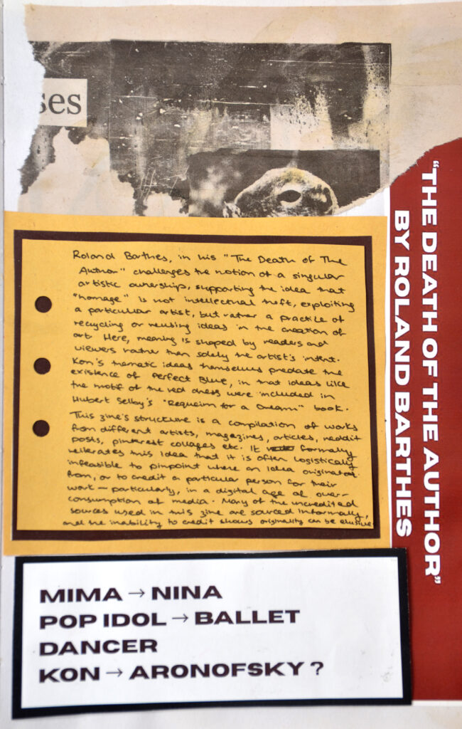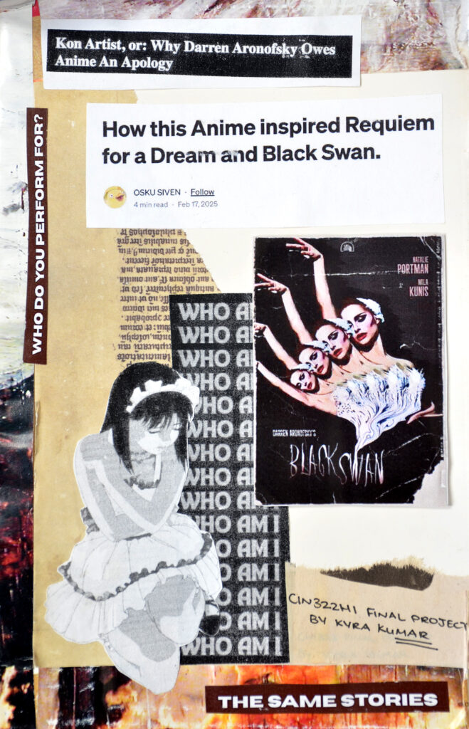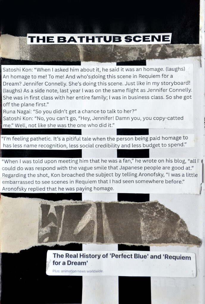This project is a zine that explores how Satoshi Kon’s Perfect Blue (1997) influenced Darren Aronofsky’s Requiem for a Dream (2000) and Black Swan (2010). Through side-by-side images, comparisons, timelines, and curated texts, the zine examines whether Aronofsky’s use of Kon’s imagery and themes functions as homage or crosses into artistic appropriation. It highlights the strong visual and narrative parallels across the films—especially around identity loss, gendered violence, performance pressure, and psychological breakdown.