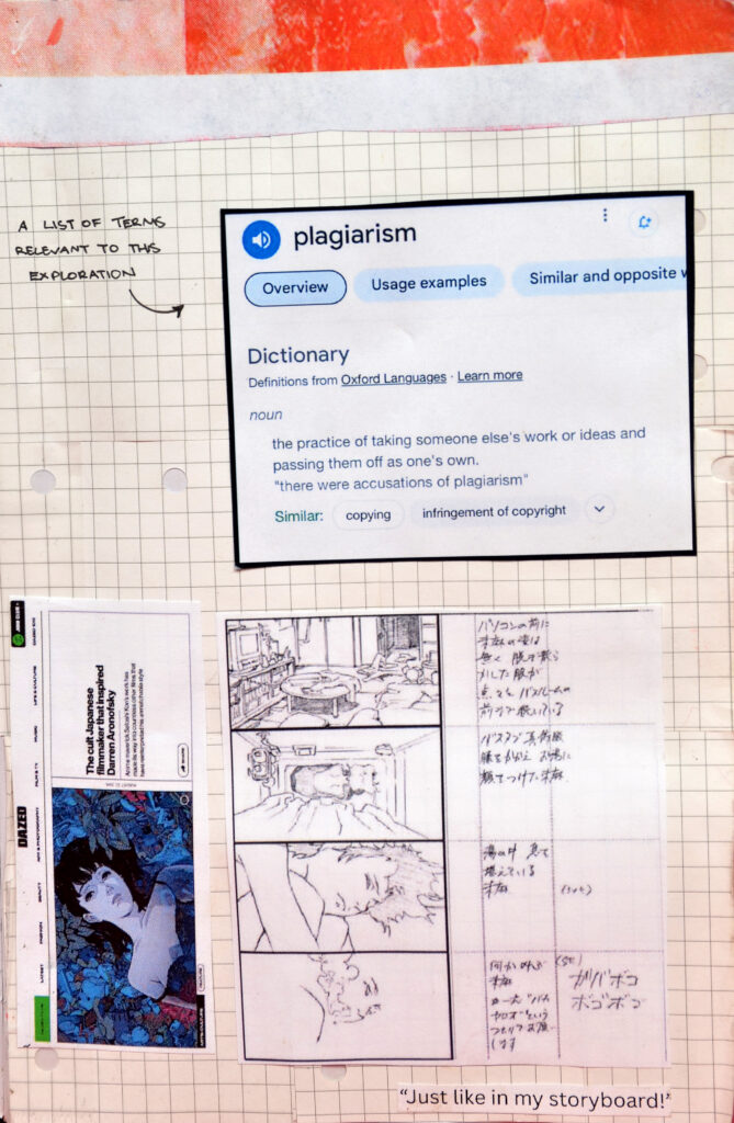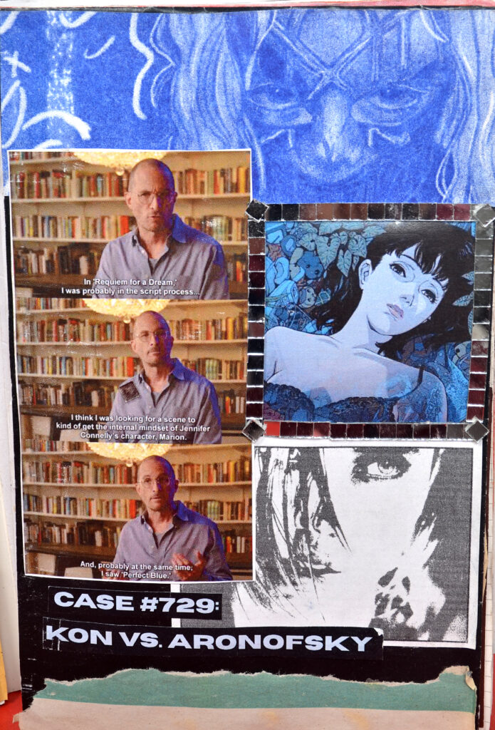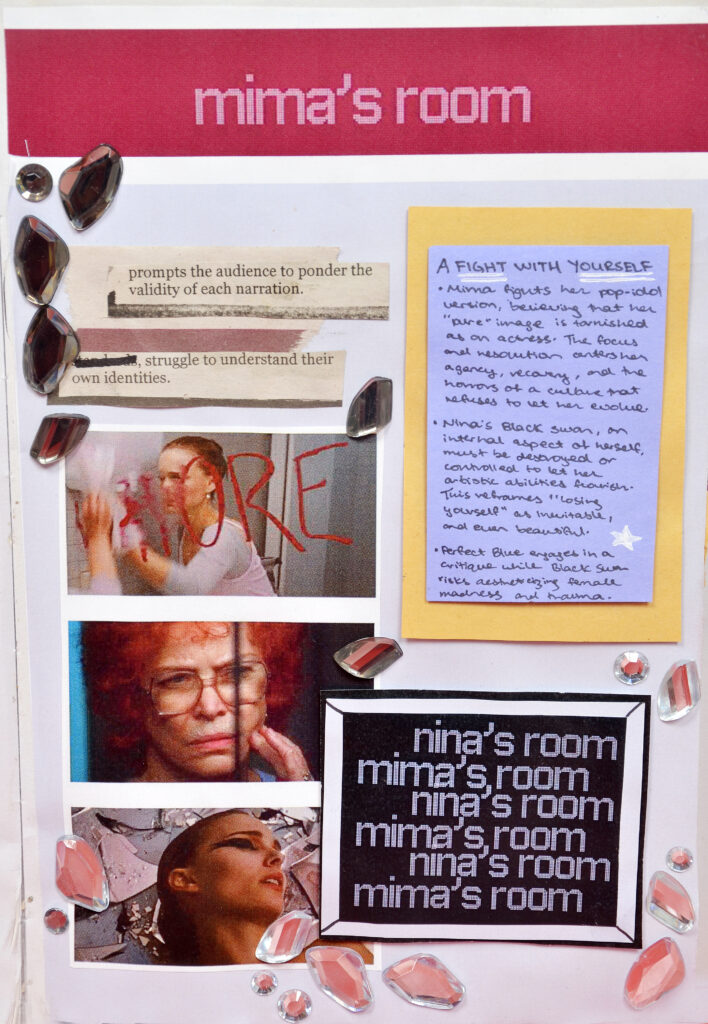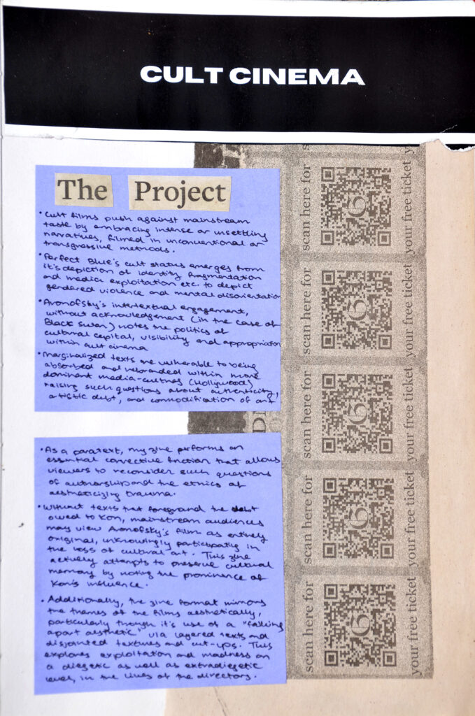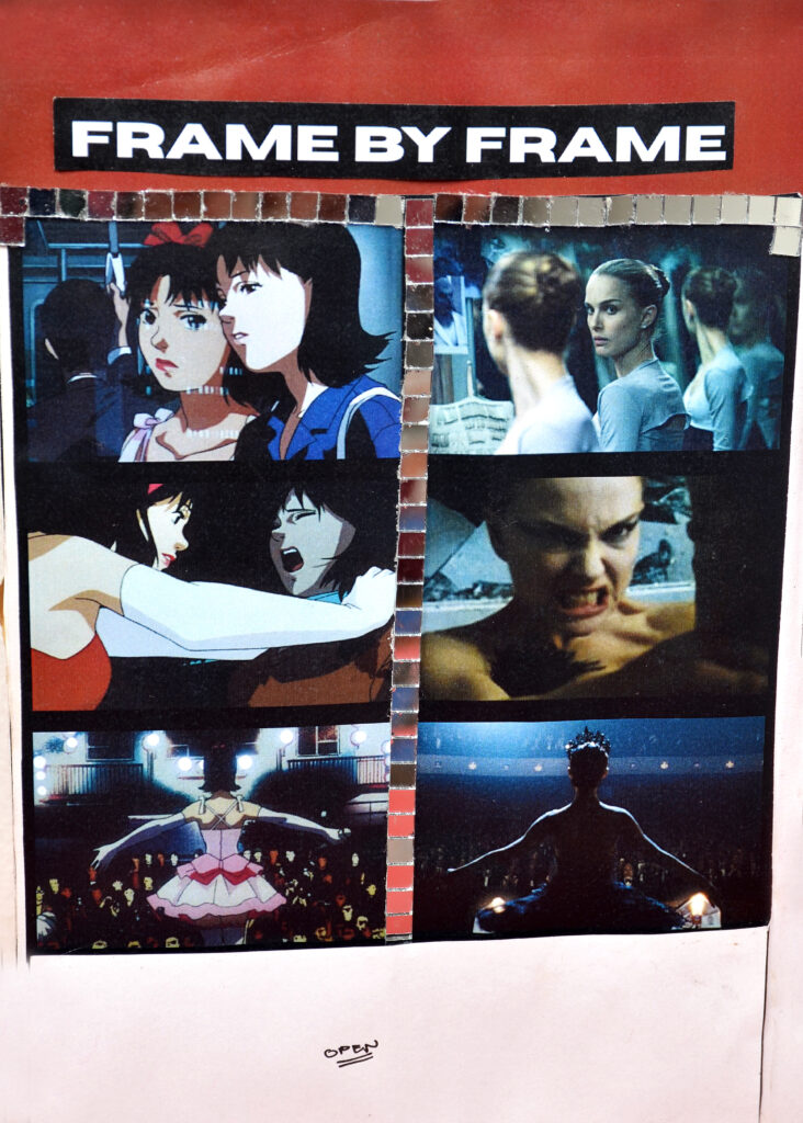 This project is a zine that explores how Satoshi Kon’s Perfect Blue (1997) influenced Darren Aronofsky’s Requiem for a Dream (2000) and Black Swan (2010). Through side-by-side images, comparisons, timelines, and curated texts, the zine examines whether Aronofsky’s use of Kon’s imagery and themes functions as homage or crosses into artistic appropriation. It highlights the strong visual and narrative parallels across the films—especially around identity loss, gendered violence, performance pressure, and psychological breakdown.